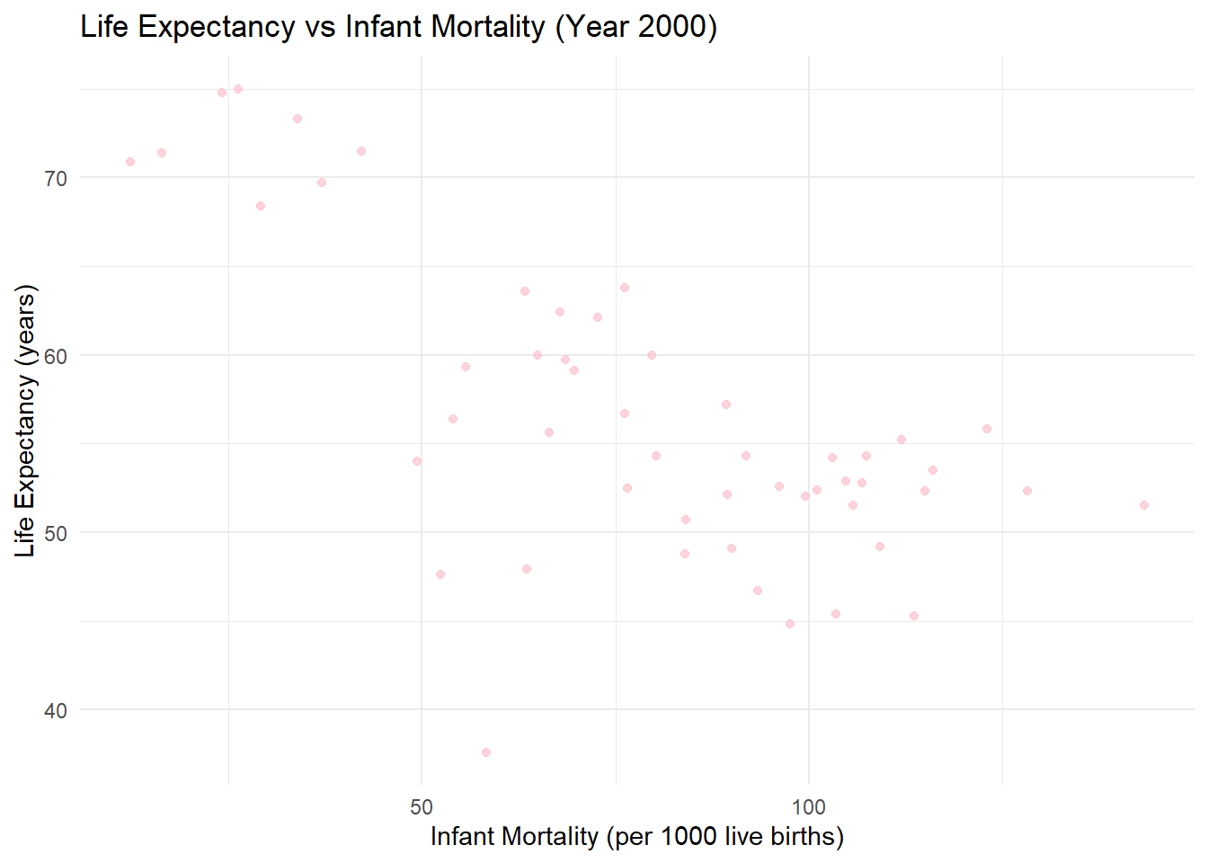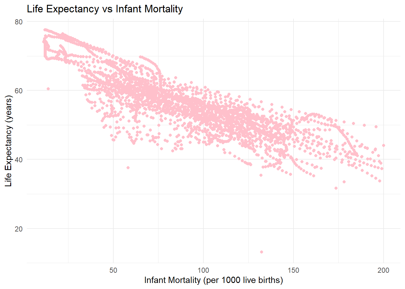 # Infant mortality is a strong and significant predictor of life expectancy, while population size shows no meaningful relationship. These results highlight the importance of addressing healthcare and living conditions to improve life expectancy rather than focusing on population size.Part 2