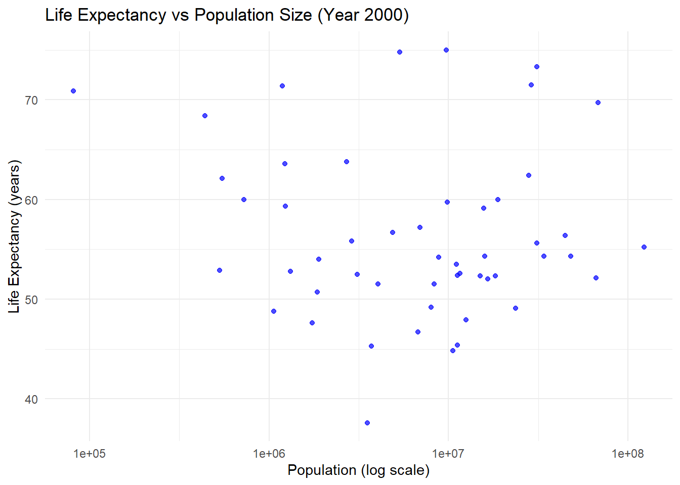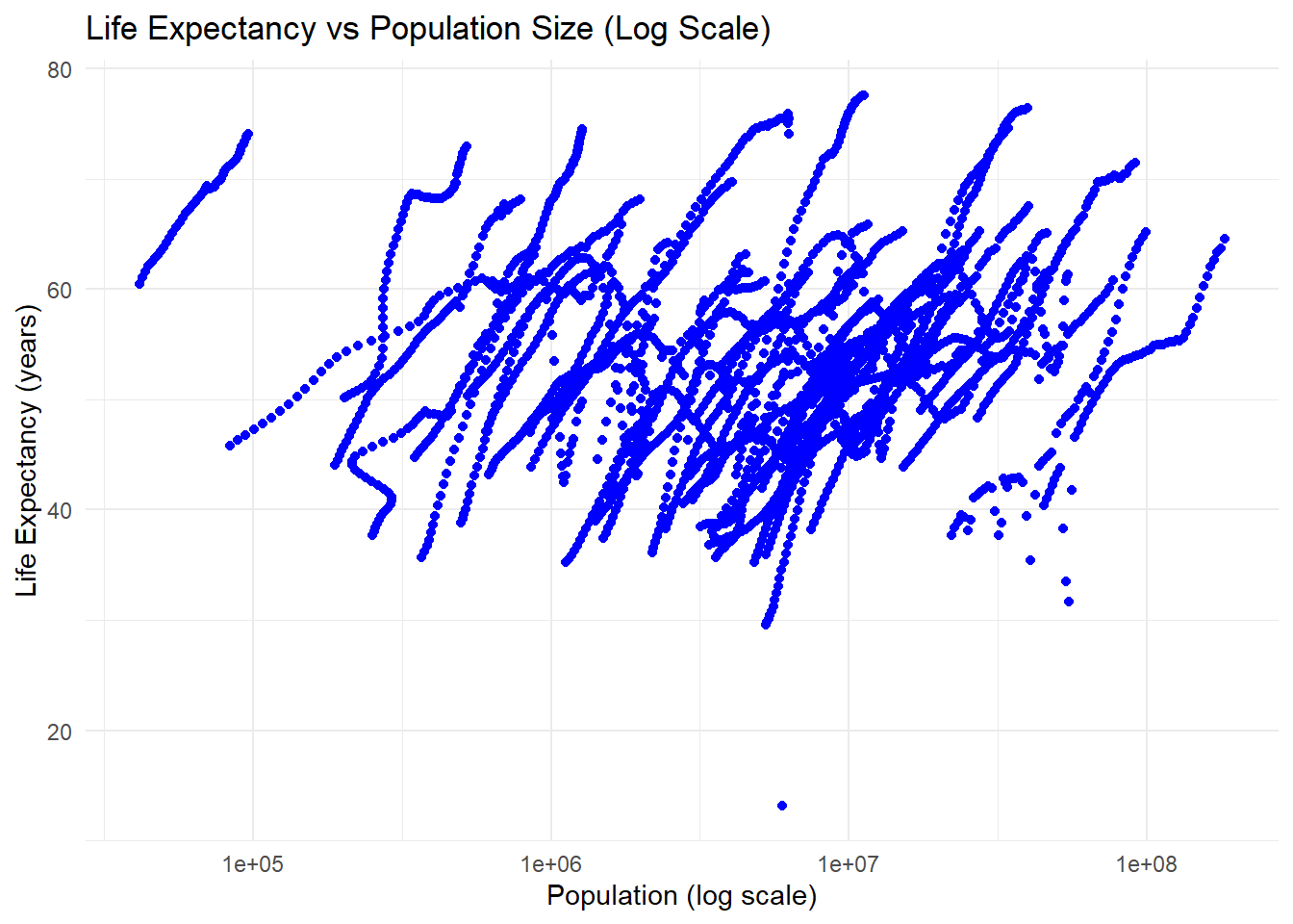 #- The \ (R^2 = 0.0052 \) confirms that population size does not explain variability in life expectancy.