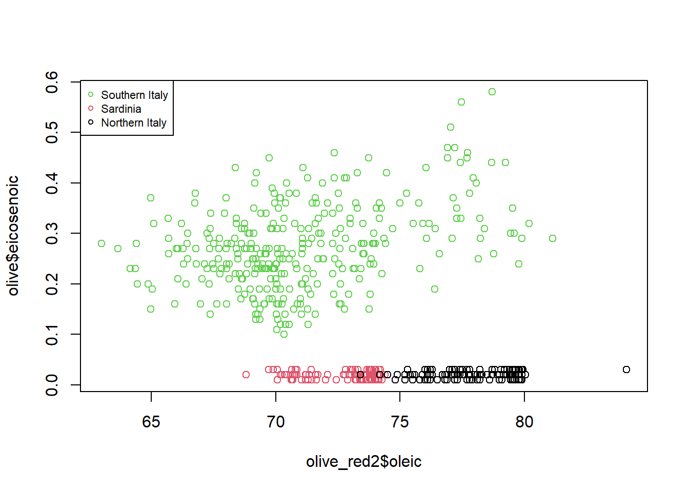 plot(olive_red2$oleic, olive$eicosenoic, col = olive$region)