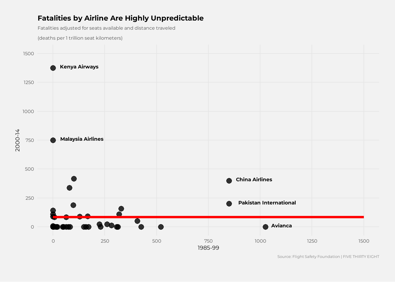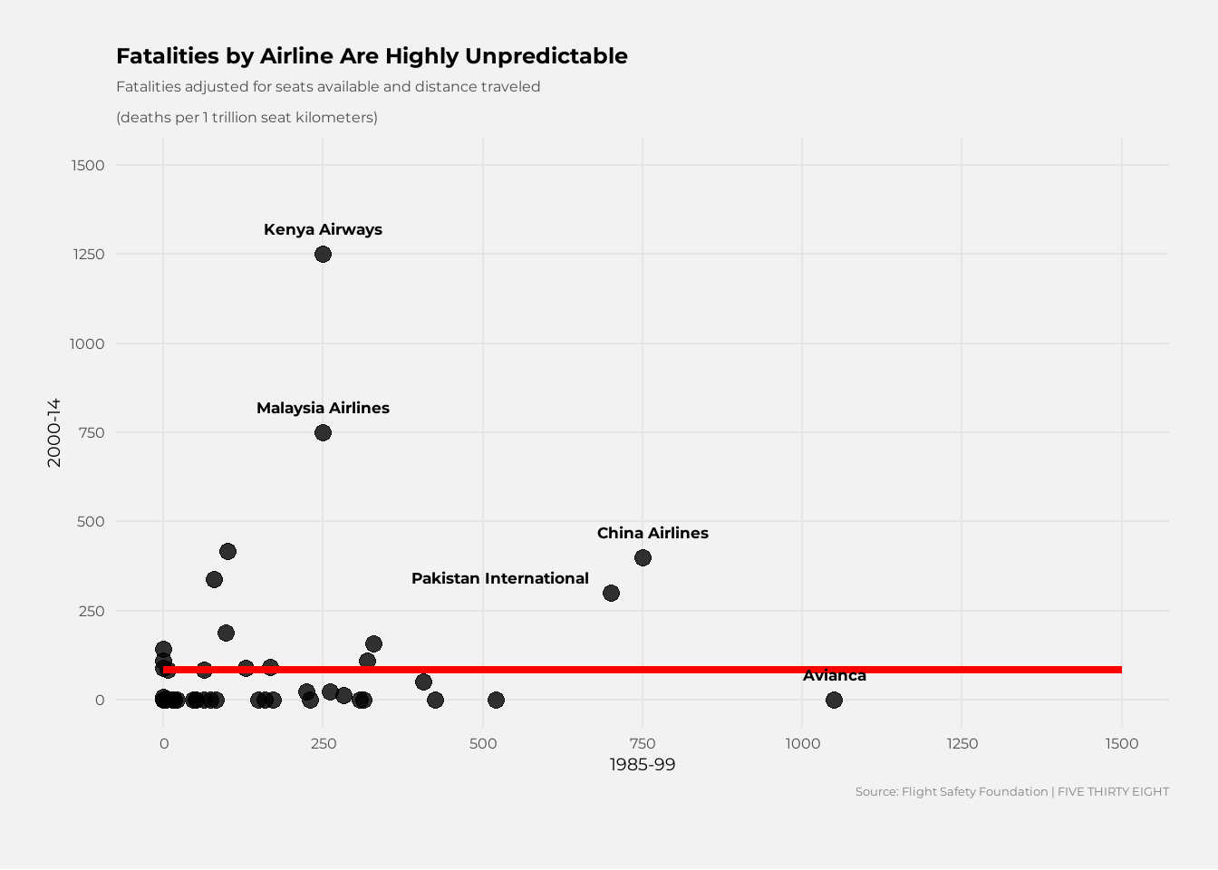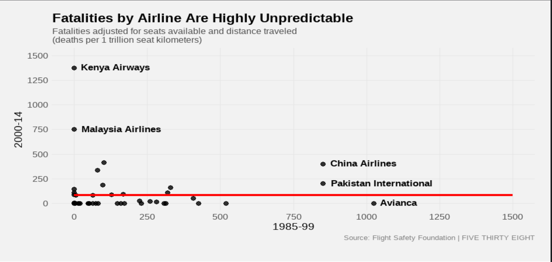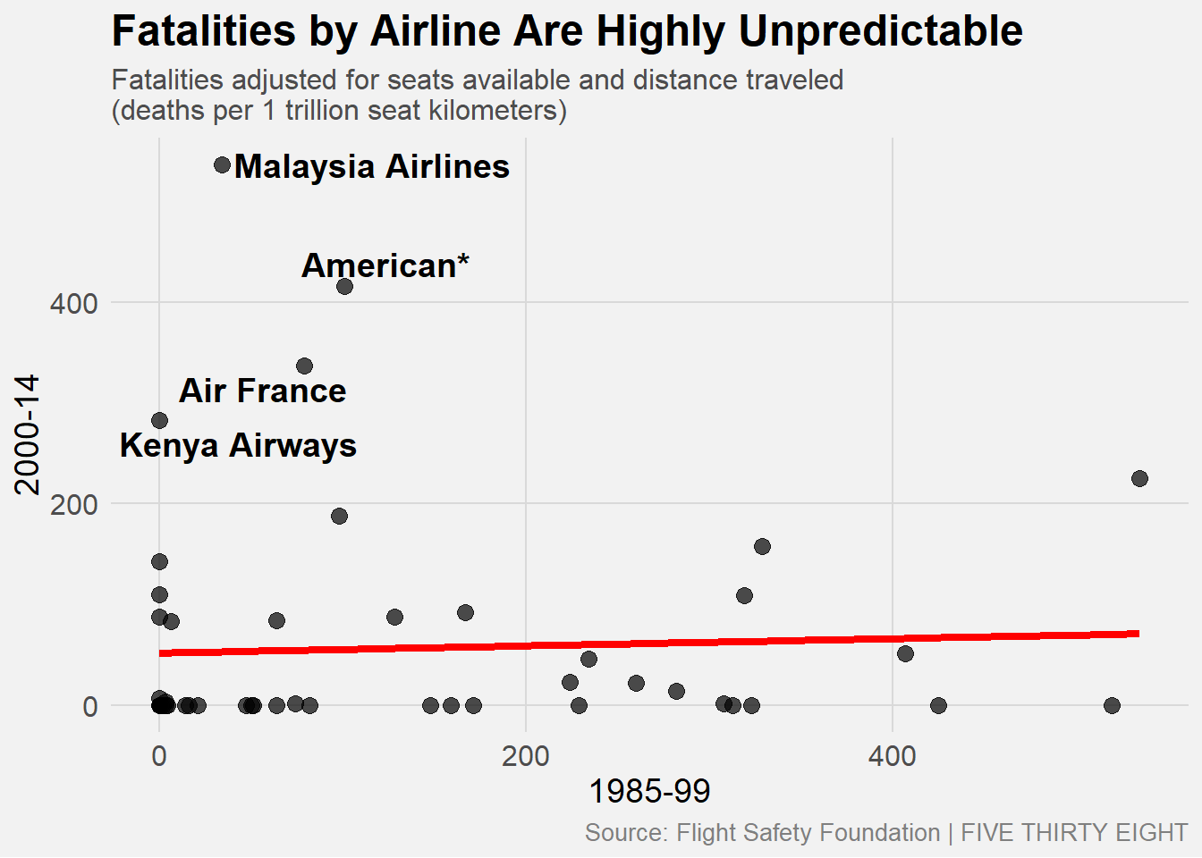 X-axis: Fatalities (1985-99) Y-axis: Fatalities (2000-14) Dots: Represent airlines Trend Line: Add a flat red regression line (like in the original graph) Label specific airlines (Kenya Airways, Malaysia Airlines, China Airlines, Pakistan International, and Avianca)
